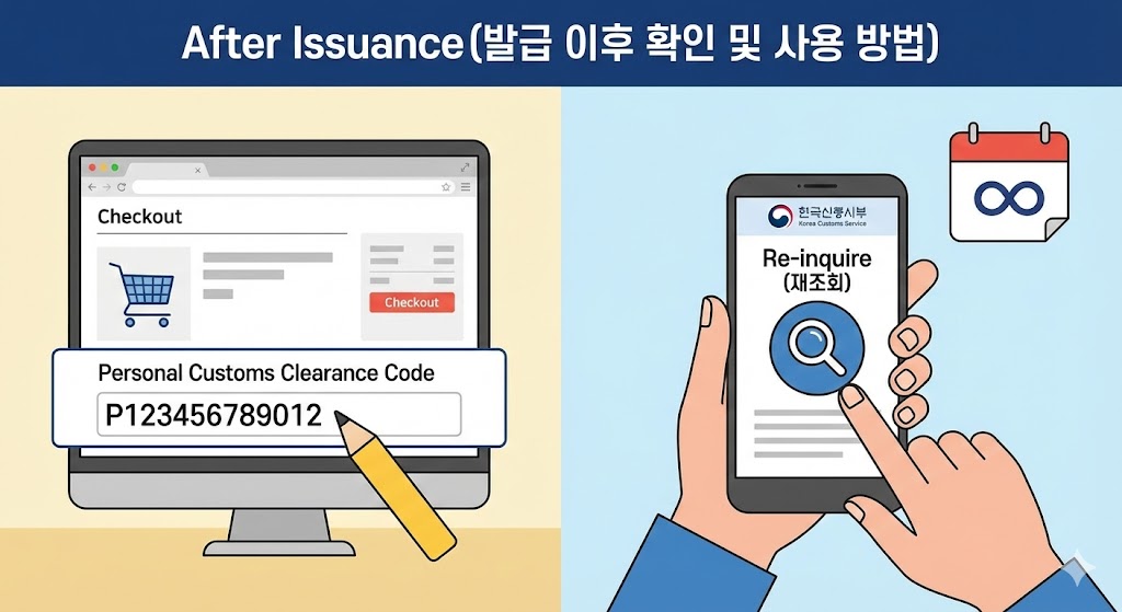 발급된 번호는 별도의 유효기간이 없어 계속 사용 가능합니다. 해외 쇼핑몰 주문 시 배송지 정보 입력란에 ‘개인통관고유부호’를 넣어주면 되고, 배송대행지에서도 동일하게 번호를 요구합니다. 번호는 관세청 사이트에서 언제든지 조회할 수 있으며, 분실하더라도 재발급이 아닌 ‘재조회’만 하면 됩니다. 즉, 개인통관고유부호 발급 후에는 관리가 매우 간편합니다.