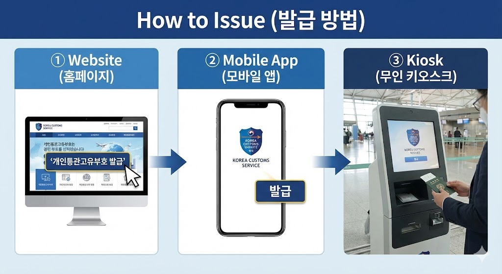 가장 흔한 방법은 관세청 전자통관 시스템에서 온라인 발급입니다. 모바일 앱이나 공항 키오스크에서도 가능합니다. 상황에 따라 원하는 방식으로 개인통관고유부호 발급하면 됩니다.