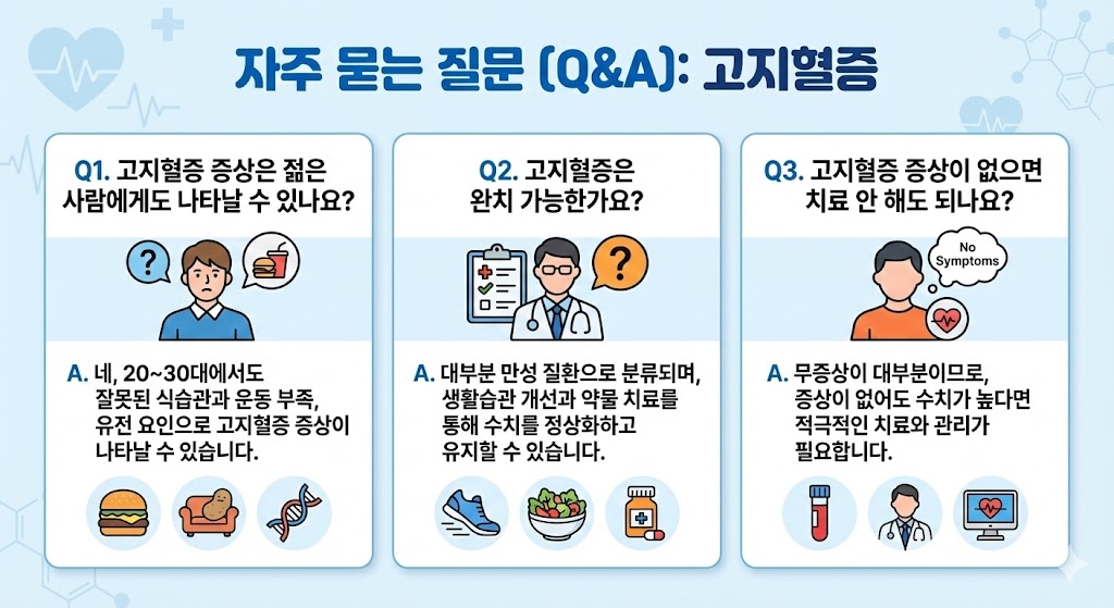 A. 네, 20~30대에서도 잘못된 식습관과 운동 부족, 유전 요인으로 고지혈증 증상이 나타날 수 있습니다.