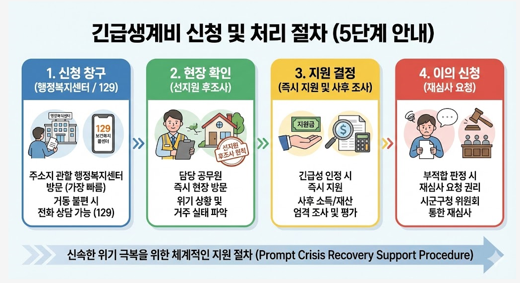 긴급생계비 지원 자격조건에 부합한다고 판단되면 지체 없이 가까운 읍면동 행정복지센터를 방문하거나 보건복지 상담센터를 통해 신청해야 합니다.