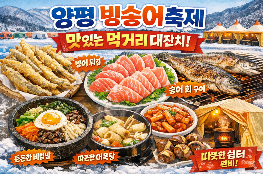 - 따뜻한 쉼터: 추위를 피할 수 있는 대형 텐트와 난로가 완비되어 있어 쾌적하게 식사하며 양평 빙송어축제의 여유를 만끽할 수 있습니다.