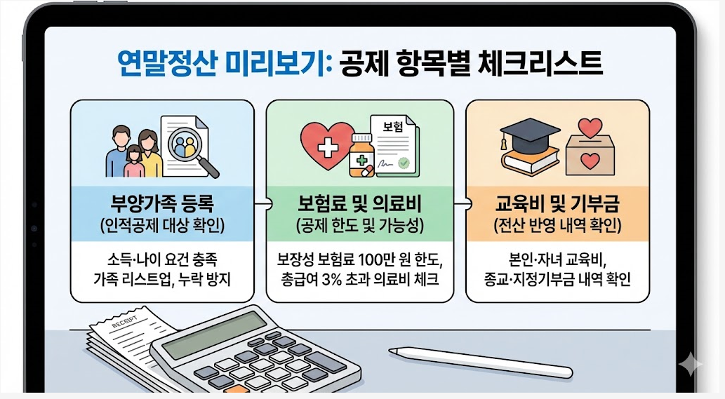 - 보험료 및 의료비: 보장성 보험료 100만 원 한도 내 공제와 총급여 3% 초과 의료비에 대한 세액공제 가능성을 미리 가늠해 봅니다.