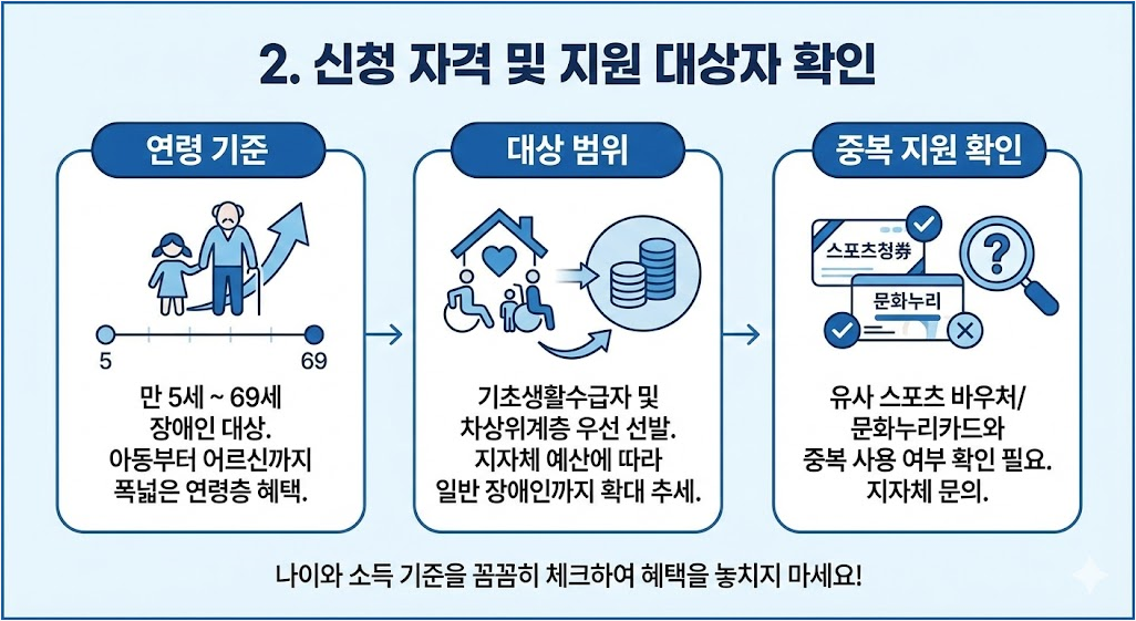 - 중복 지원 확인: 유사한 성격의 스포츠 바우처나 문화누리카드와 중복 사용이 가능한지 여부를 지자체 담당 부서를 통해 사전에 파악하는 것이 좋습니다.