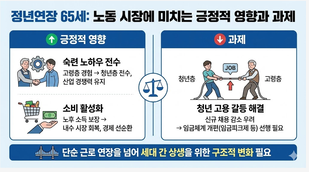 - 청년 고용 갈등 해결: 기업들이 정년 연장으로 인해 신규 채용을 줄이지 않도록 임금체계 개편(임금피크제 등)이 선행되어야 한다는 목소리가 큽니다.