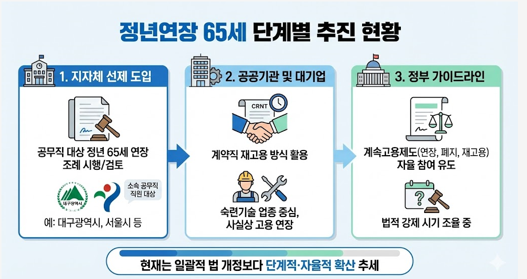 현재 정년연장 65세 시행 시기는 일괄적인 법 개정보다는 공공 부문과 지자체를 중심으로 단계적인 도입이 이루어지고 있는 형국입니다.