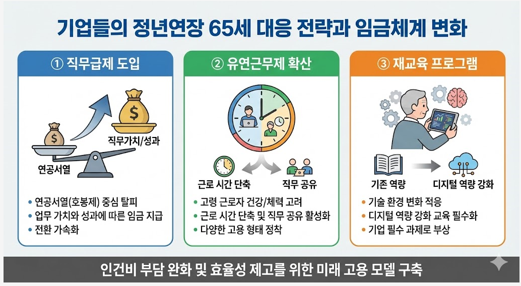 기업들은 정년연장 65세 시행 시기에 맞춰 인건비 부담을 줄이고 효율성을 높이기 위한 다양한 고용 모델을 검토하고 있습니다.