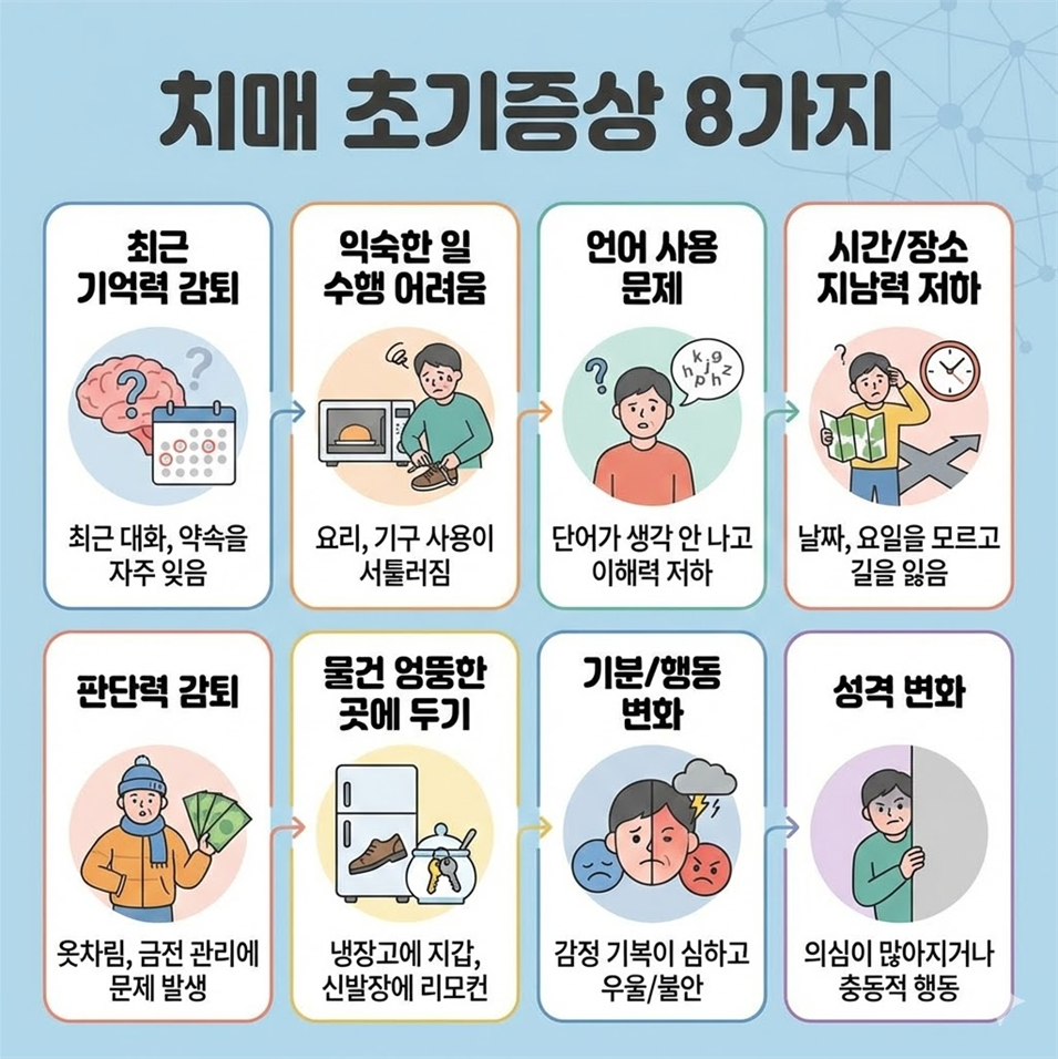 - 가족의 역할: 환자 본인은 증상을 인지하지 못할 수도 있으므로 주변 가족들이 치매 초기증상 8가지를 숙지하고 변화를 민감하게 살피는 애정 어린 관심이 필요합니다. 건강한 백세 시대를 위해 뇌 건강 관리에 지금 바로 관심을 기울여 보시기 바랍니다.