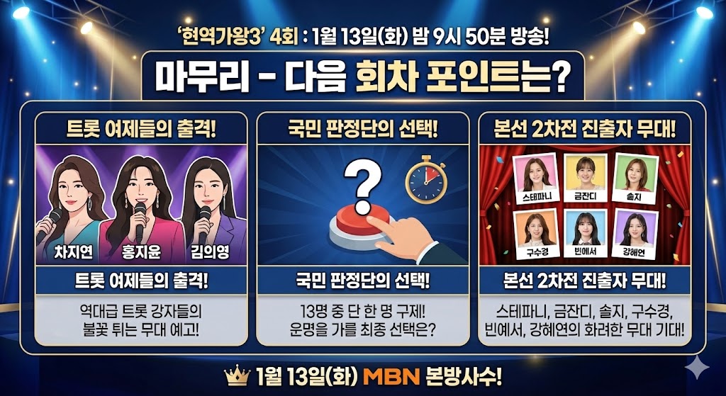 ‘현역가왕3’ 4회는 1월 13일(화) 밤 9시 50분 방송 예정입니다.